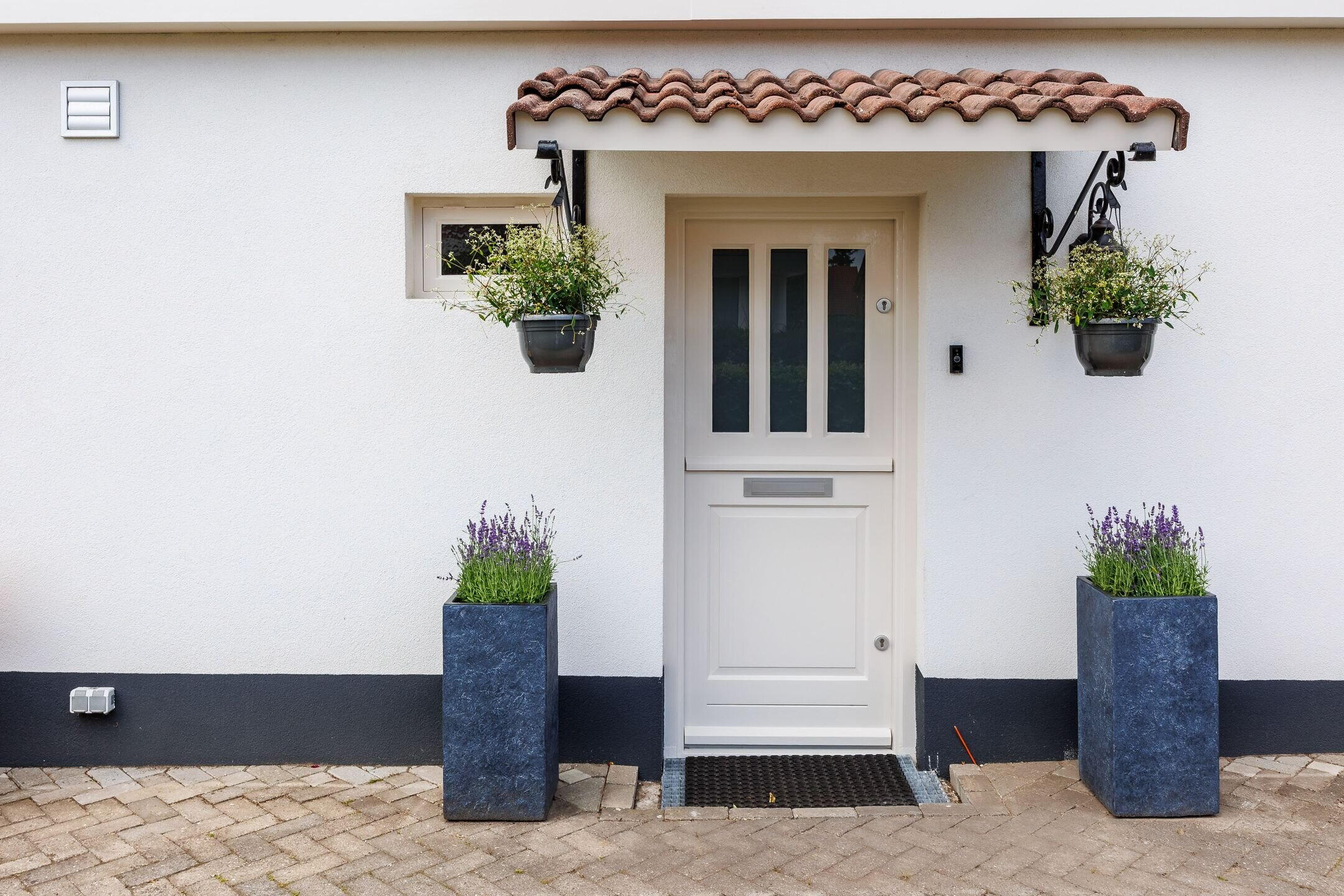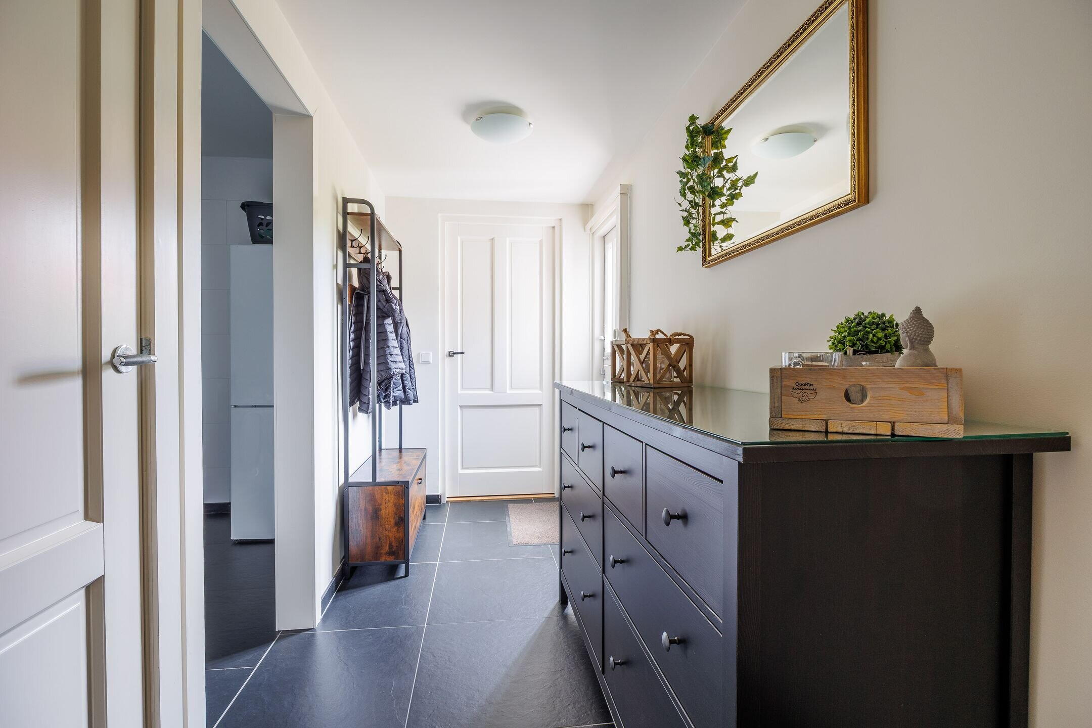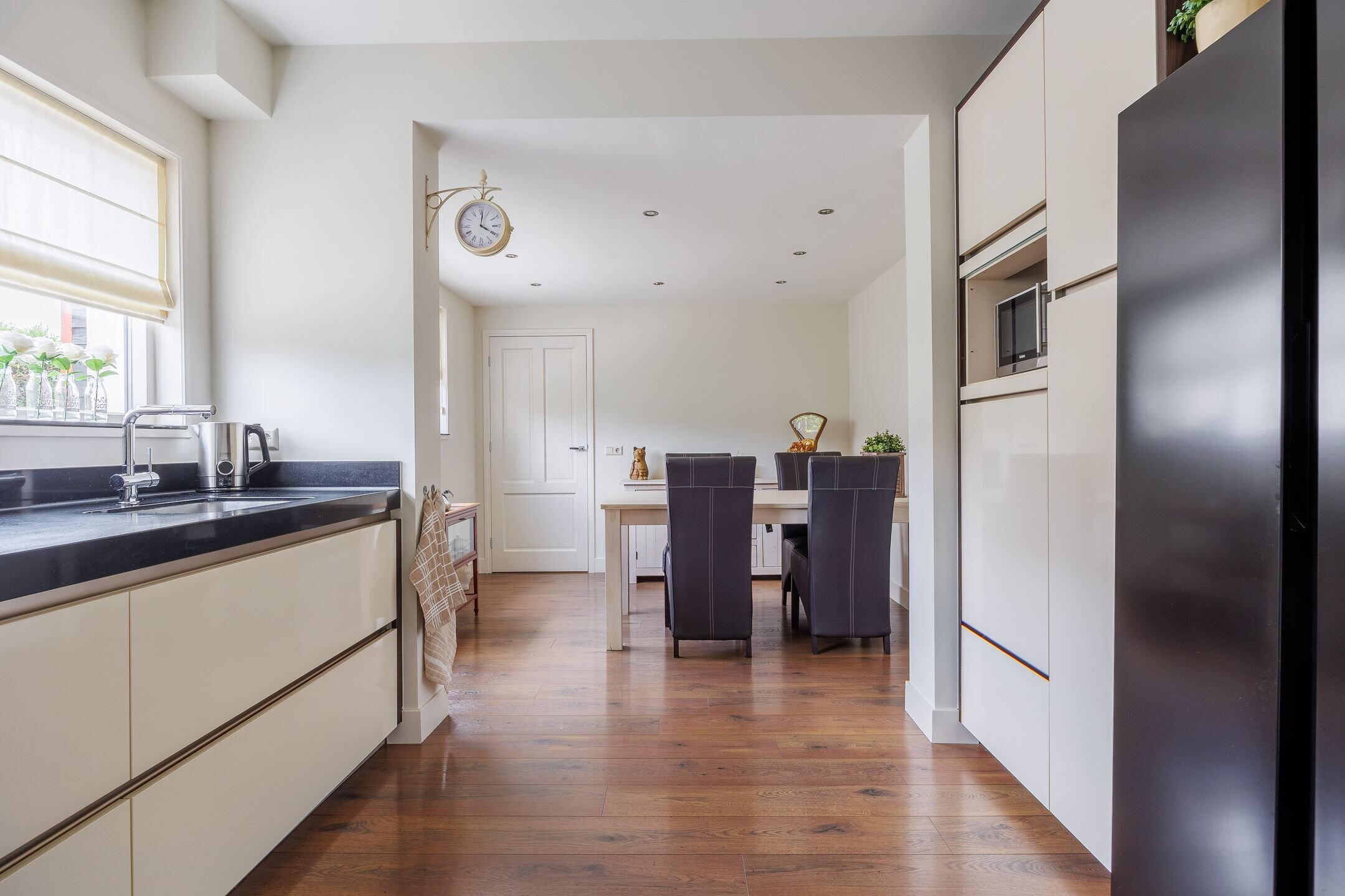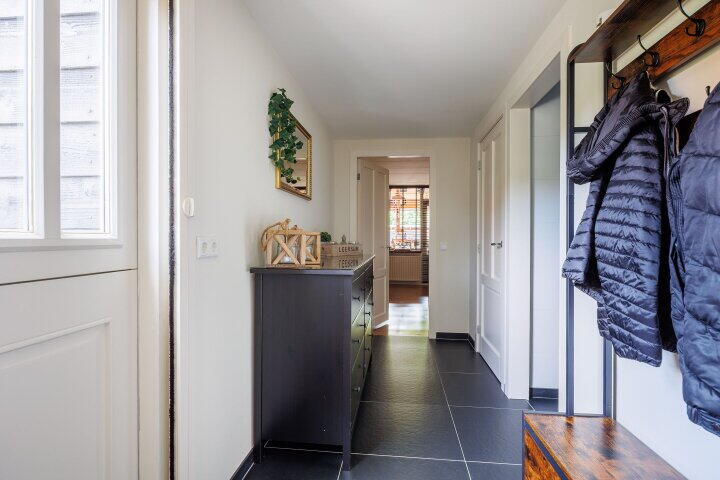 De woonkamer loopt door naar een ruime entreehal, die toegang biedt tot zowel een separaat toilet als tot de kelder en de gezellige woonkeuken. Tevens is hier ruimte voor een thuiswerkplek.