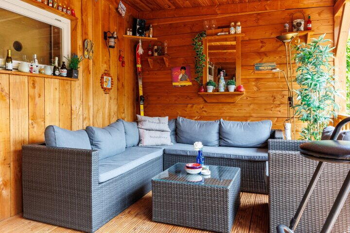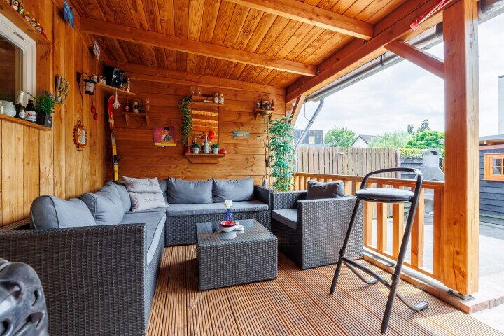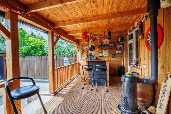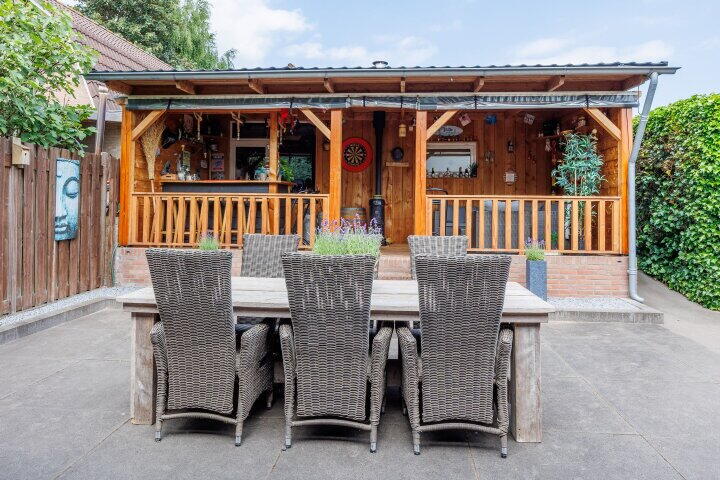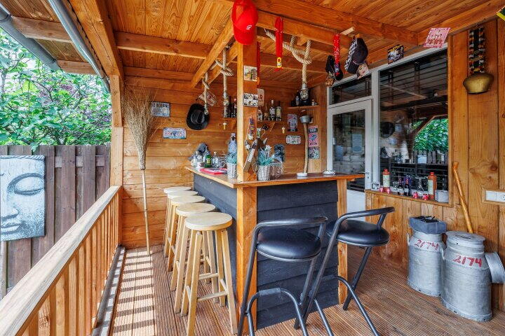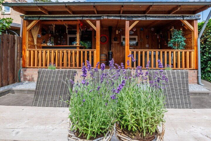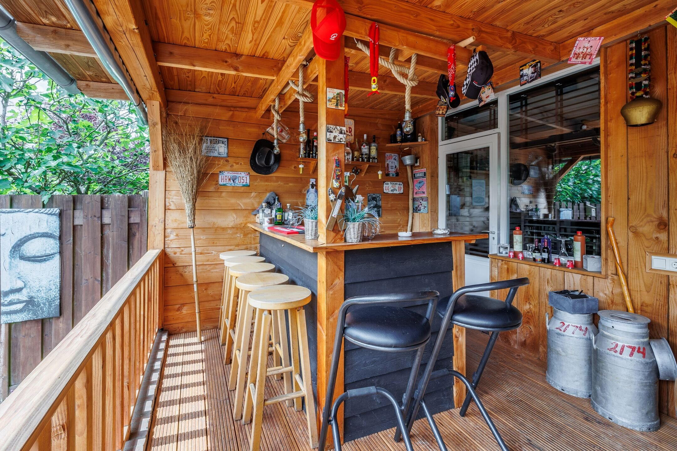 Via de achterdeur loopt u zo de op het zuiden gelegen veranda op. Hier is het heerlijk beschut zitten in zowel de zomer- als in de wintermaanden, mede dankzij de gezellige houtkachel en het windscherm. Nodig wat vrienden uit voor een gezellige avond in de bar op de veranda.