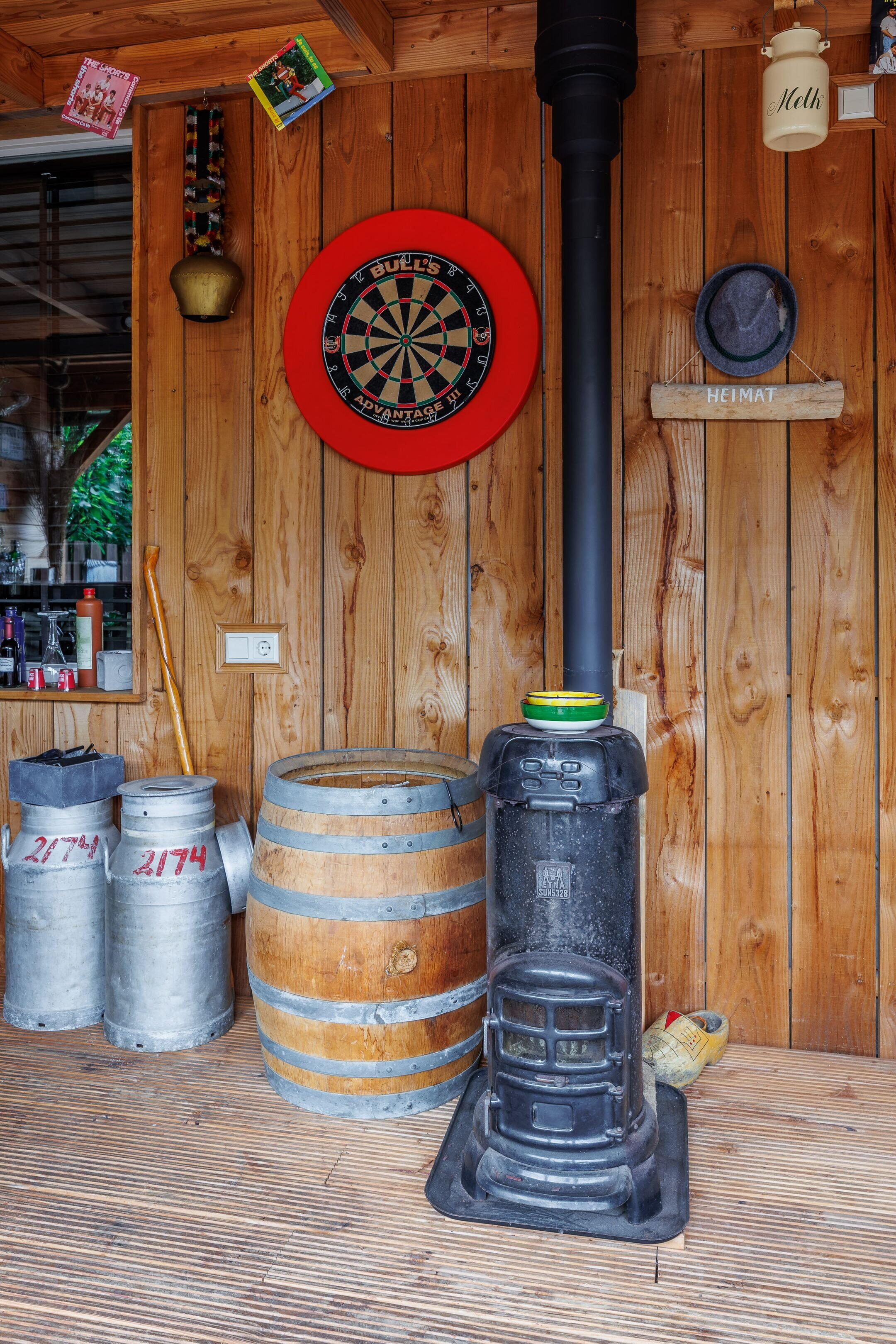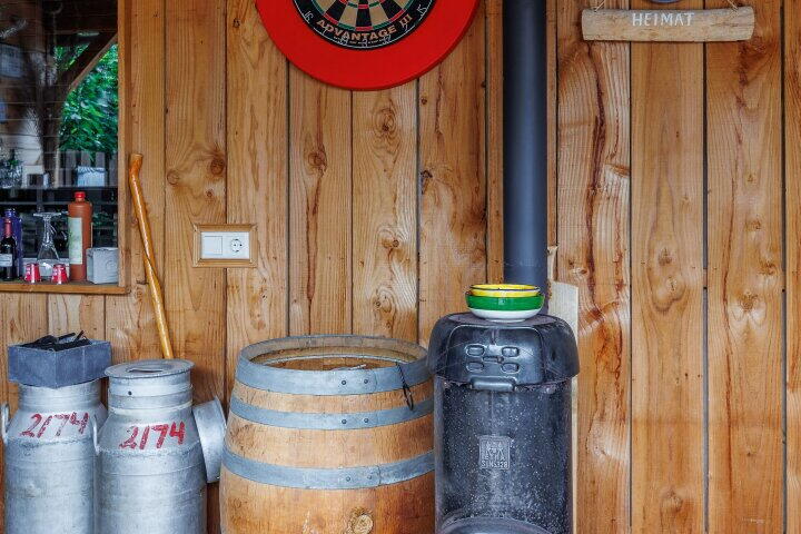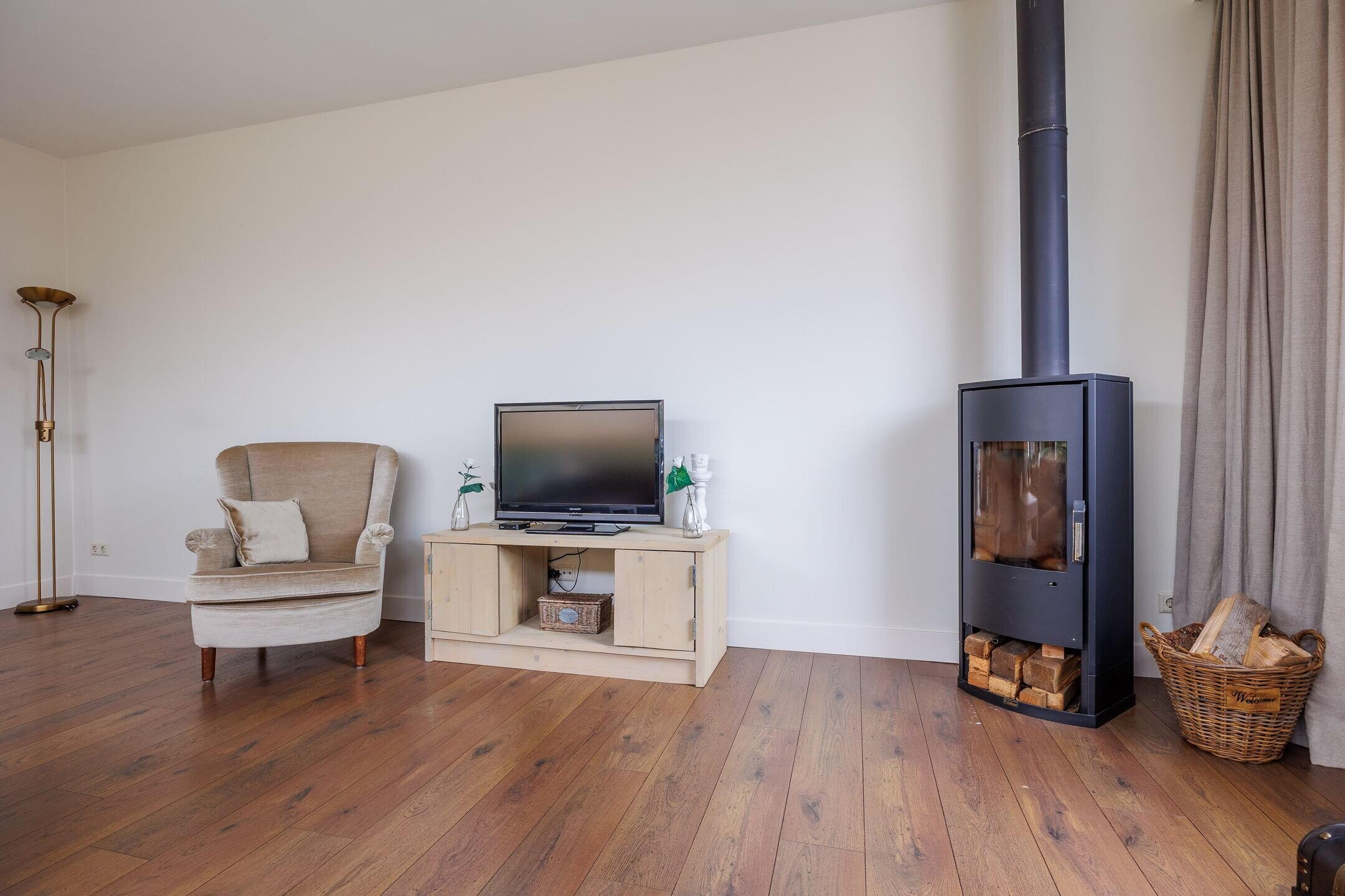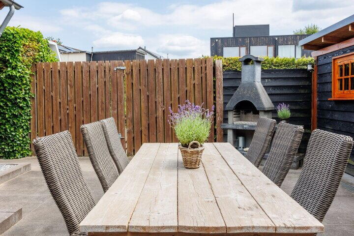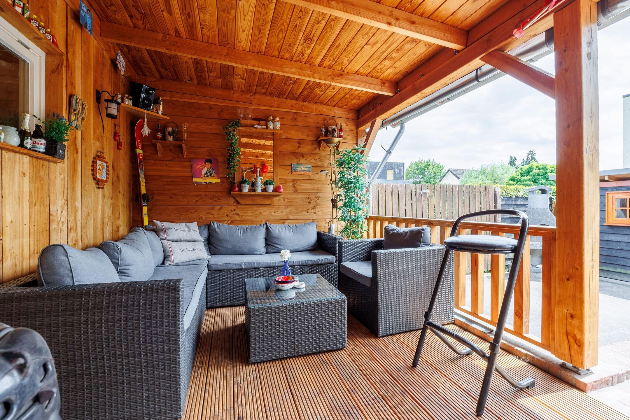 Via de achterdeur loopt u zo de op het zuiden gelegen veranda op. Hier is het heerlijk beschut zitten in zowel de zomer- als in de wintermaanden, mede dankzij de gezellige houtkachel en het windscherm. Nodig wat vrienden uit voor een gezellige avond in de bar op de veranda.