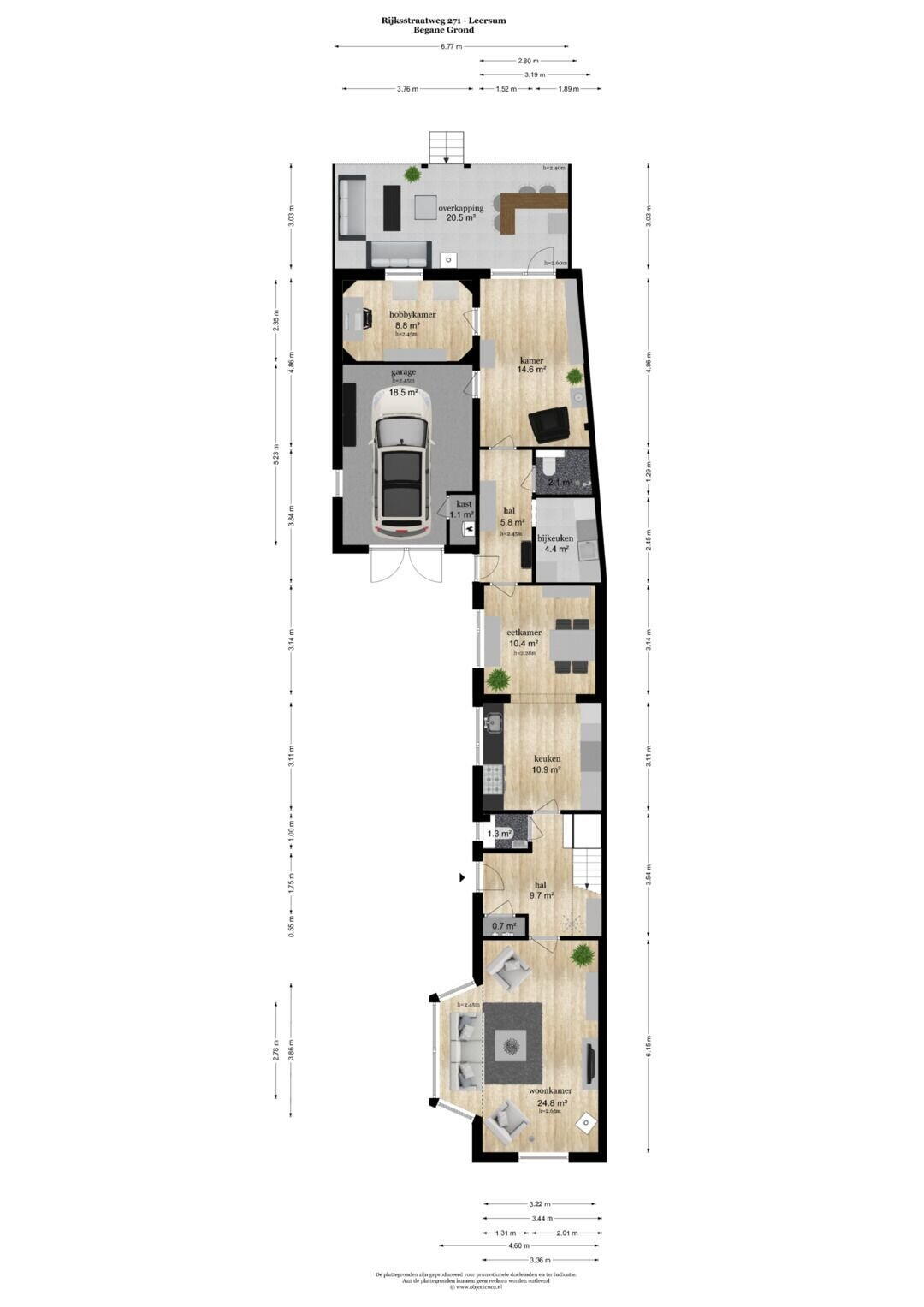 Aangrenzend vind u een praktische bijkeuken met aansluitingen voor de wasmachine en droger. In de ruimte is een douche en zijn alvast aansluitingen voorbereid voor een toilet om deze ruimte als tweede badkamer te gebruiken. Achterin de woning bevindt zich een royale multifunctionele ruimte met eigen ingang – perfect voor een kantoor aan huis of hobbyruimte. Naast deze ruimte is een kamer als studio ingericht.